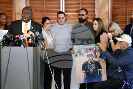 Attorney Benjamin Crump answers questions with family members of Kevin Zavala —including Zavala's mother Ana Zavala and father Carlos Rodriguez Ortiz, right—during a press conference in downtown Orlando, Fla., Wednesday, Sept. 24, 2025. (Joe Burbank/Orlando Sentinel via AP)