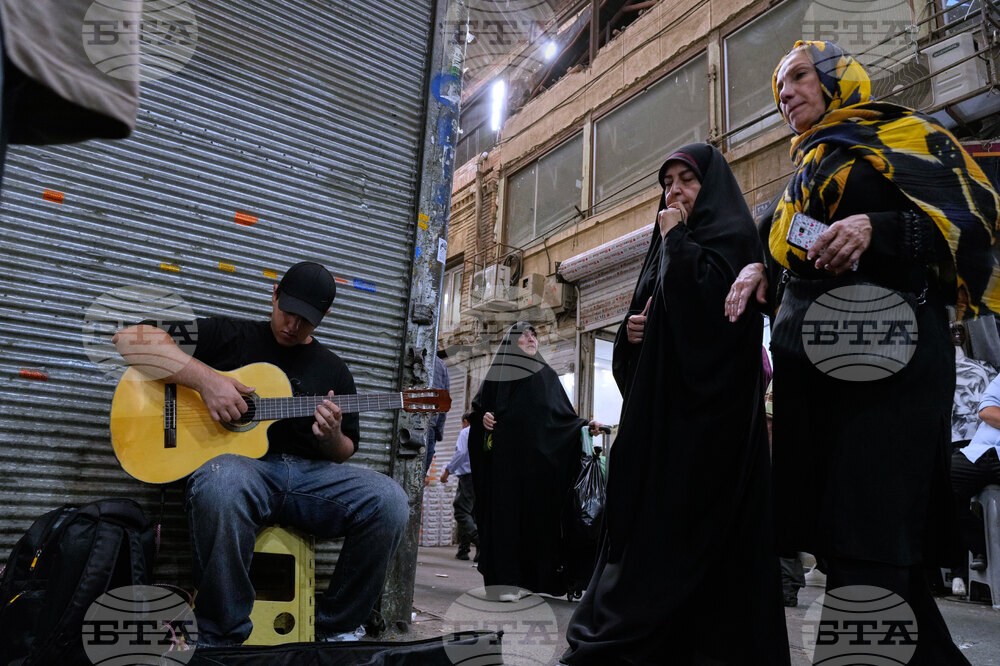 A street musician plays guitar as people walk in the old main bazaar of Tehran, Iran, Wednesday, Sept. 24, 2025. (AP Photo/Vahid Salemi)