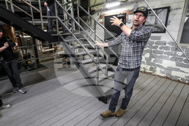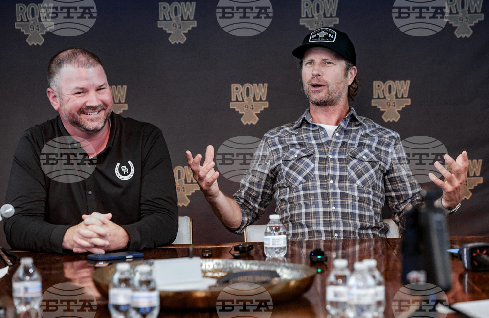 Country music singer Dierks Bentley, right, talks about the release of his Row 94 bourbon with Lofted Spirits vice president of operations Justin Willett at left during an industry event to announce the release of the bourbon at Green River Distilling, Wednesday, Sept. 24, 2025, in Owensboro, Ky. (Greg Eans/The Messenger-Inquirer via AP)