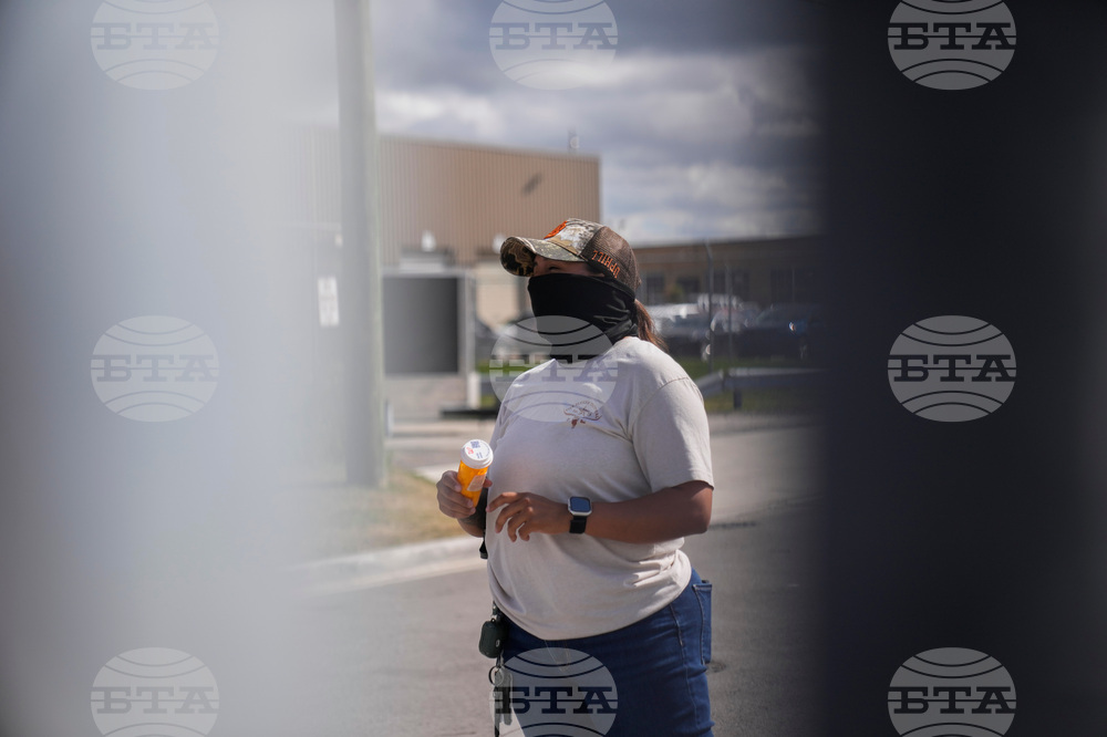 A federal agent receives diabetes medication from Jessica Aguilar and her son John for husband and father husband Carlos Aguilar, who Aguilar said was taken by unidentified agents in DeKalb on his way to work this morning, to a federal agent through a fence outside the U.S. Immigration and Customs Enforcement (ICE) building Wednesday, Sept. 24, 2025, in Broadview, Ill. (AP Photo/Erin Hooley)