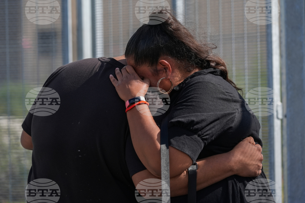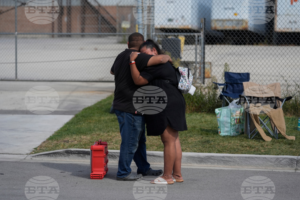 Jessica Aguilar and her son John embrace after passing diabetes medication for her husband Carlos Aguilar, who she said was taken by unidentified agents in DeKalb on his way to work this morning, to a federal agent through a fence outside the U.S. Immigration and Customs Enforcement (ICE) building Wednesday, Sept. 24, 2025, in Broadview, Ill. (AP Photo/Erin Hooley)