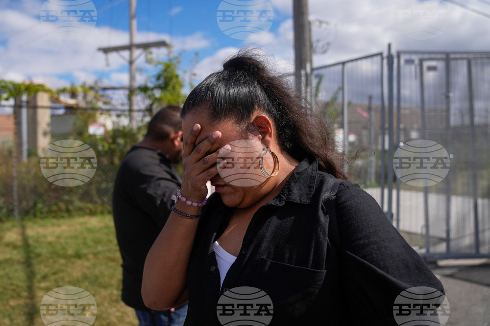 Jessica Aguilar and her son John are emotinal after passing diabetes medication for her husband Carlos Aguilar, who she said was taken by unidentified agents in DeKalb on his way to work this morning, to a federal agent through a fence outside the U.S. Immigration and Customs Enforcement (ICE) building Wednesday, Sept. 24, 2025, in Broadview, Ill. (AP Photo/Erin Hooley)
