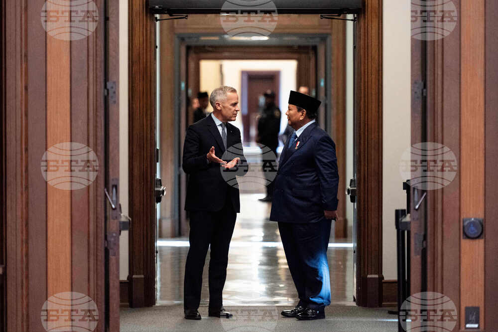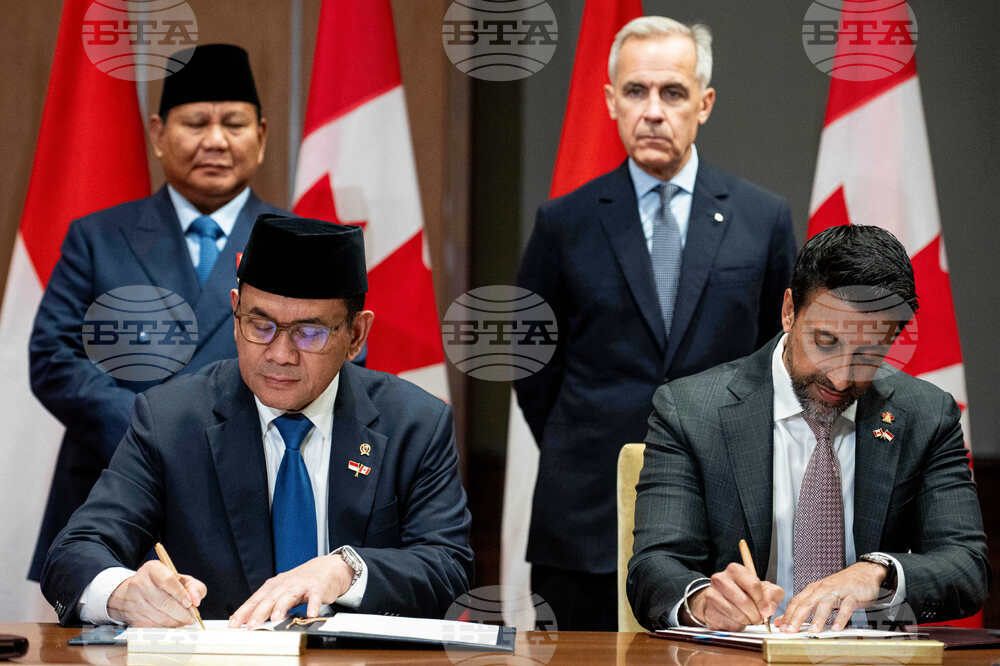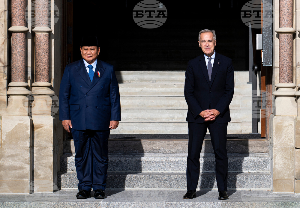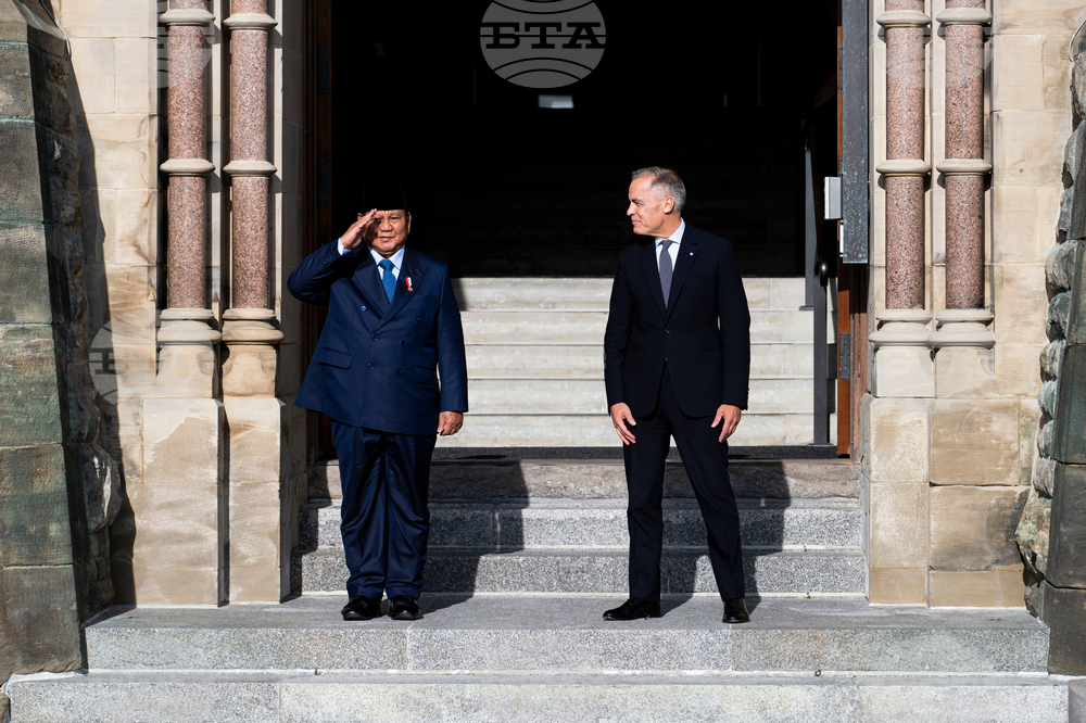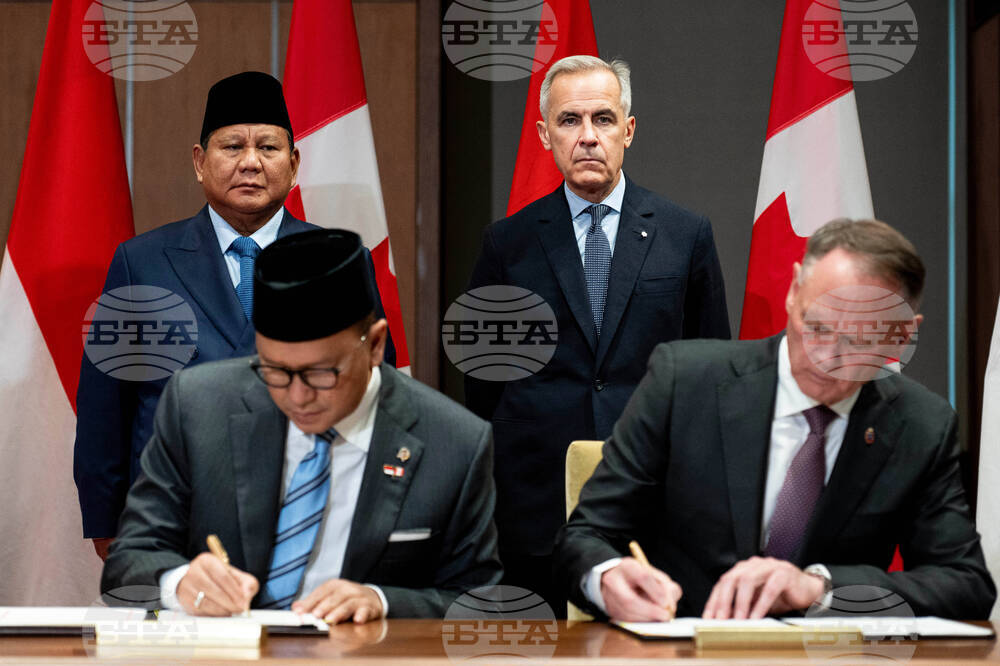 President of Indonesia Prabowo Subianto, back left, and Canada's Prime Minister Mark Carney, back centre, look on as Indonesia Minister of Investment and Head of Investment Coordinating Board Rosan Perkasa Roeslani, front left, and Canada's Minister of National Defence David McGuinty take part in a signing ceremony during a working visit on Parliament Hill in Ottawa, Ontario, Wednesday, Sept. 24, 2025. (Spencer Colby/The Canadian Press via AP)