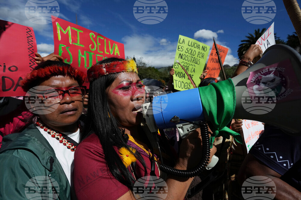 FILE - Waorani Indigenous people march to the Constitutional Court to protest for their right to consultation before the bidding for the exploration and exploitation of oil and gas on their territory in Quito, Ecuador, May 13, 2025. (AP Photo/Dolores Ochoa, File)