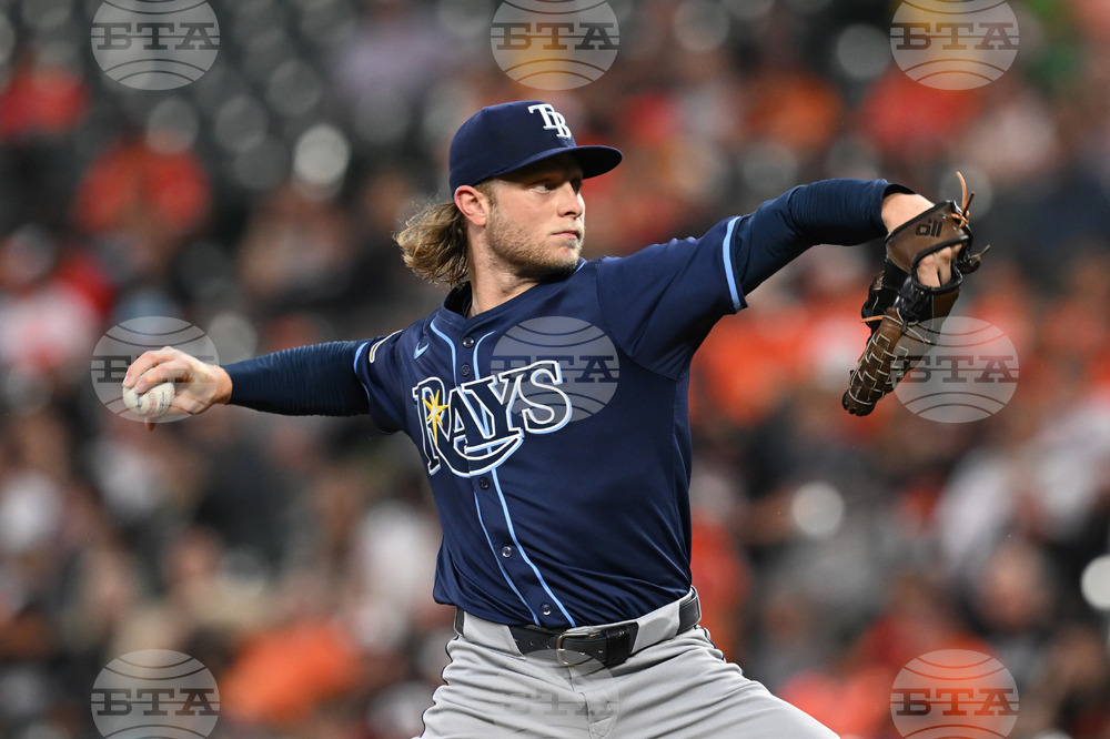 Tampa Bay Rays pitcher Shane Baz throws against the Baltimore Orioles in the first inning of a baseball game, Wednesday, Sept. 24, 2025, in Baltimore. (AP Photo/Gail Burton)