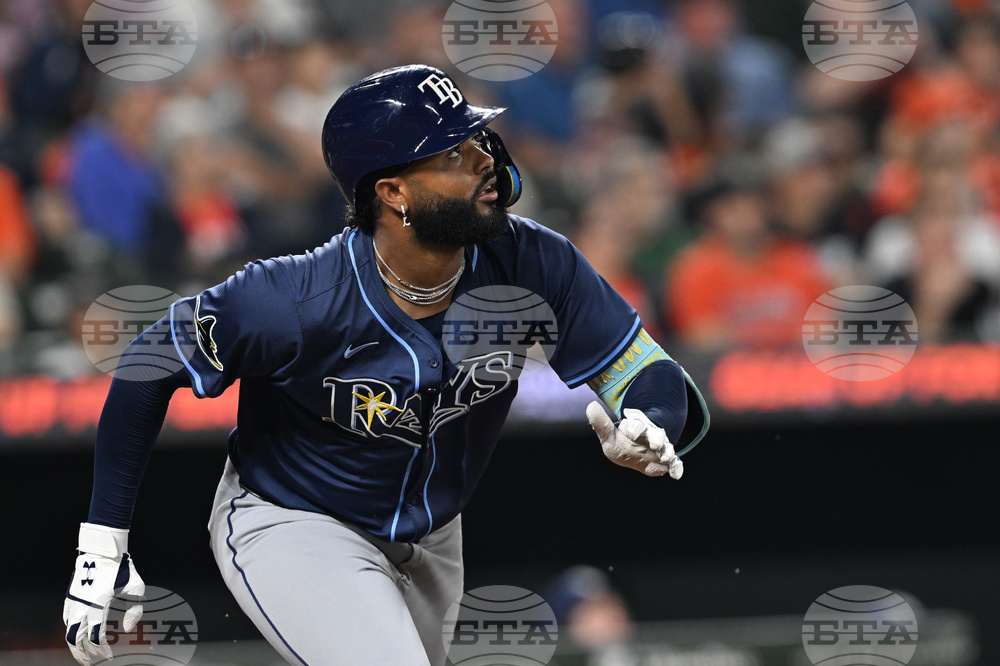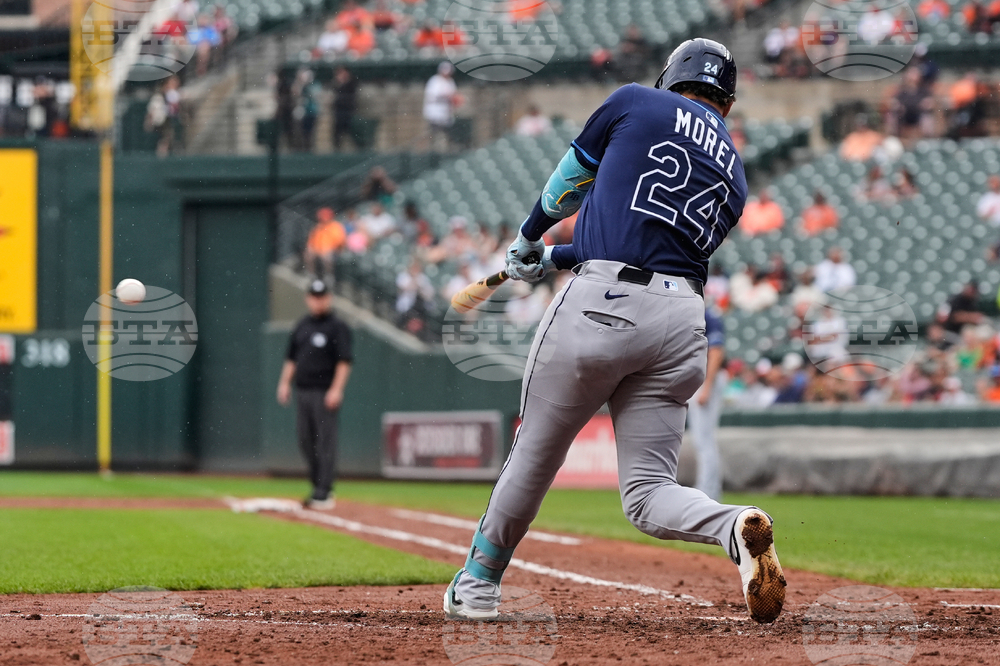 Tampa Bay Rays' Christopher Morel (24) hits a two-run double during the third inning of a baseball game against the Tampa Bay Rays, Thursday, Sept. 25, 2025, in Baltimore. (AP Photo/Stephanie Scarbrough)
