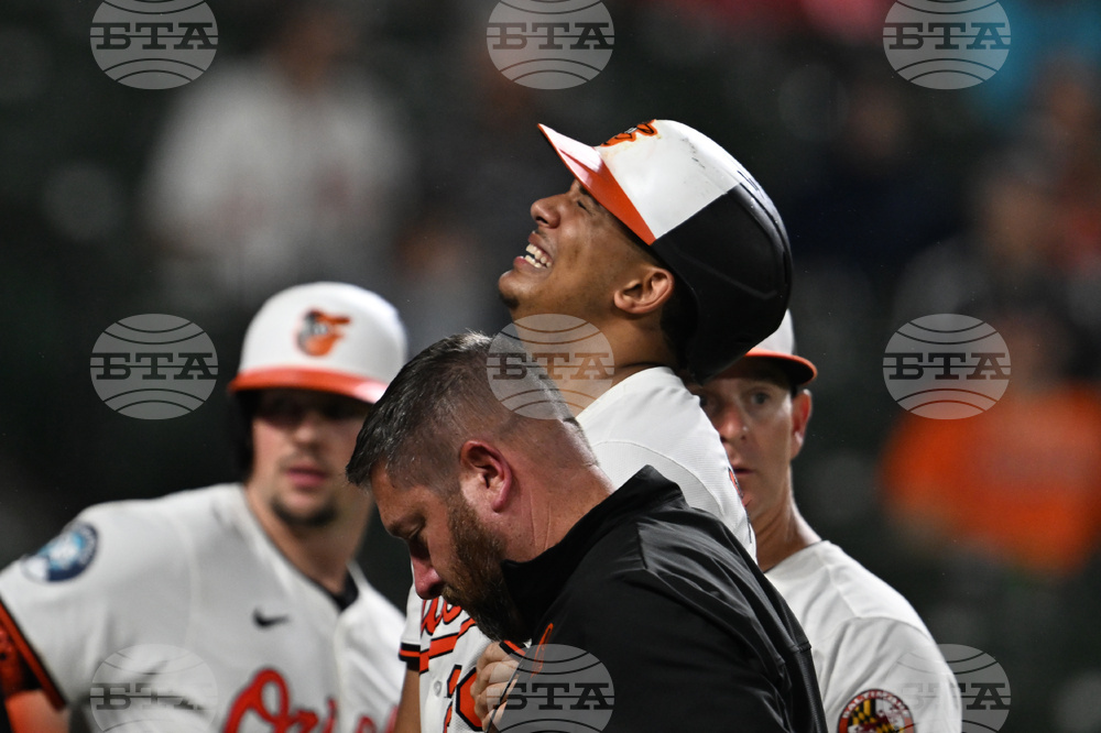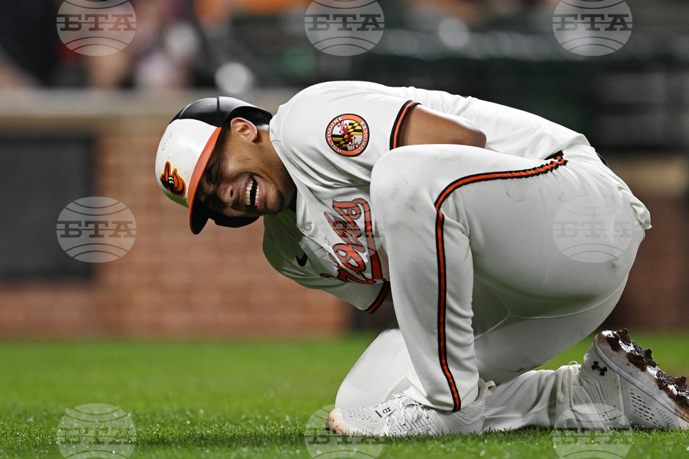 Baltimore Orioles' Samuel Basallo reacts after being hit by a pitch by Tampa Bay Rays pitcher Pete Fairbanks in the ninth inning of a baseball game, Wednesday, Sept. 24, 2025, in Baltimore. Basallo left the game. (AP Photo/Gail Burton)