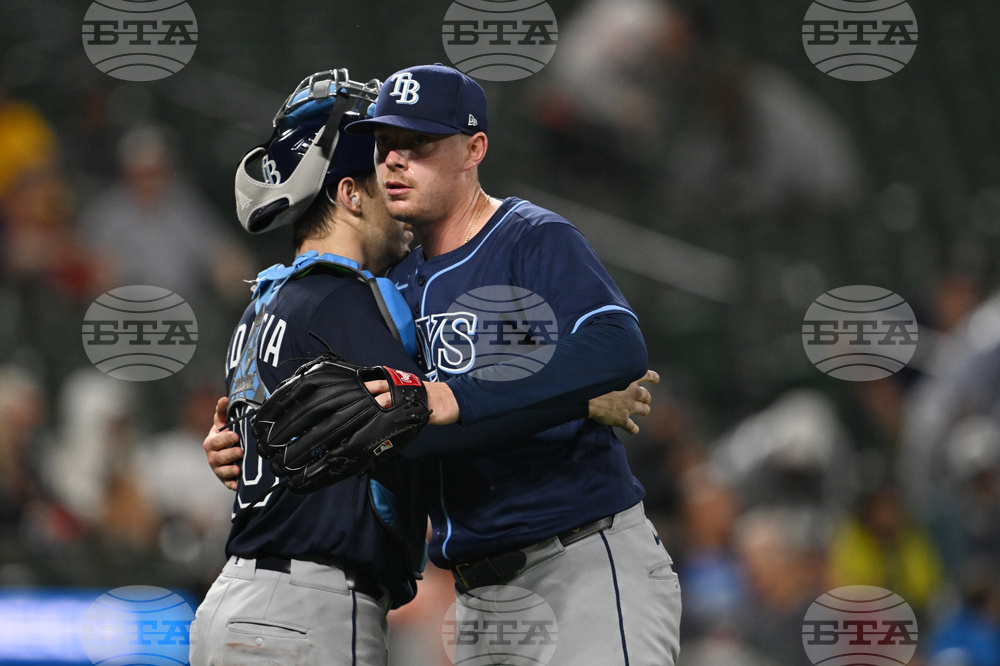 Tampa Bay Rays pitcher Pete Fairbanks, right, and catcher Hunter Feduccia celebrate their win over the Baltimore Orioles in a baseball game, Wednesday, Sept. 24, 2025, in Baltimore. (AP Photo/Gail Burton)