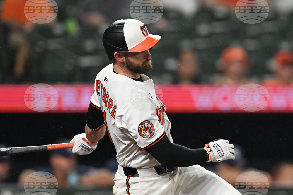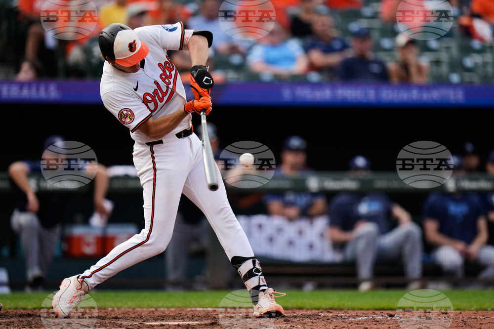Baltimore Orioles' Jordan Westburg follows through on a two run single against the Tampa Bay Rays in the eighth inning of a baseball game, Wednesday, Sept. 24, 2025, in Baltimore. (AP Photo/Gail Burton)