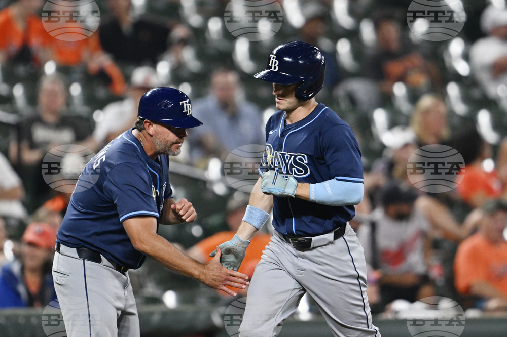 Tampa Bay Rays Jake Mangum is congratulated by third base coach Brady Williams after hitting a solo home run against the Baltimore Orioles in the eighth inning of a baseball game, Wednesday, Sept. 24, 2025, in Baltimore. The Rays won 6-2.(AP Photo/Gail Burton)