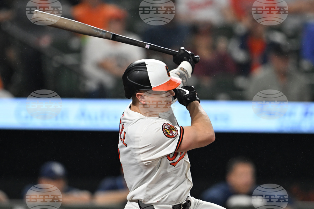 Baltimore Orioles' Tyler O'Neil follows through on a single against the Tampa Bay Rays in the seventh inning of a baseball game, Wednesday, Sept. 24, 2025, in Baltimore. (AP Photo/Gail Burton)