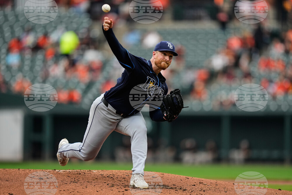 Tampa Bay Rays starting pitcher Drew Rasmussen delivers during the first inning of a baseball game against the Baltimore Orioles, Thursday, Sept. 25, 2025, in Baltimore. (AP Photo/Stephanie Scarbrough)
