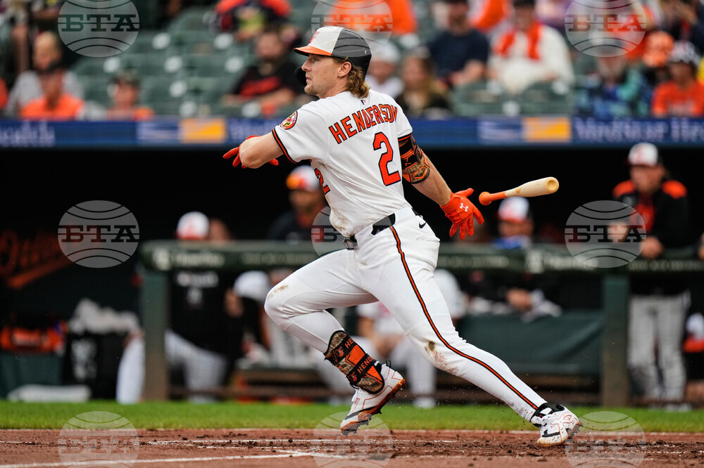 Baltimore Orioles' Gunnar Henderson (2) advances toward first base after hitting a single during the first inning of a baseball game against the Tampa Bay Rays, Thursday, Sept. 25, 2025, in Baltimore. (AP Photo/Stephanie Scarbrough)