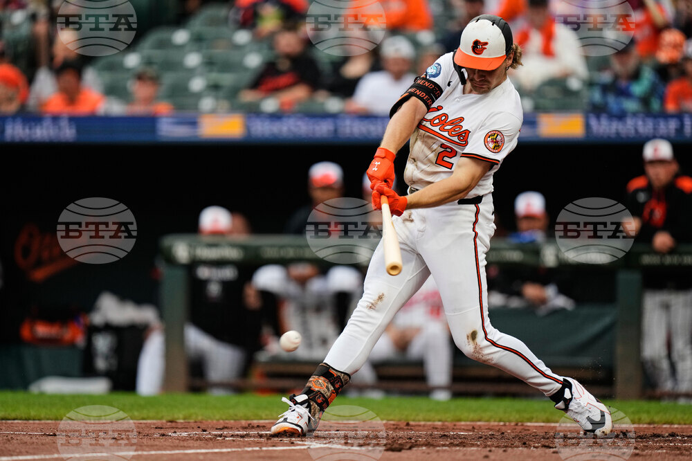 Baltimore Orioles' Gunnar Henderson (2) hits a single during the first inning of a baseball game against the Tampa Bay Rays, Thursday, Sept. 25, 2025, in Baltimore. (AP Photo/Stephanie Scarbrough)
