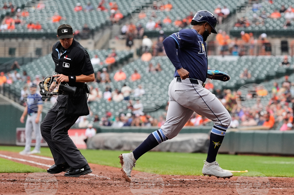 Tampa Bay Rays Junior Caminero runs to first on a single against the Baltimore Orioles in the third inning of a baseball game, Wednesday, Sept. 24, 2025, in Baltimore. (AP Photo/Gail Burton)