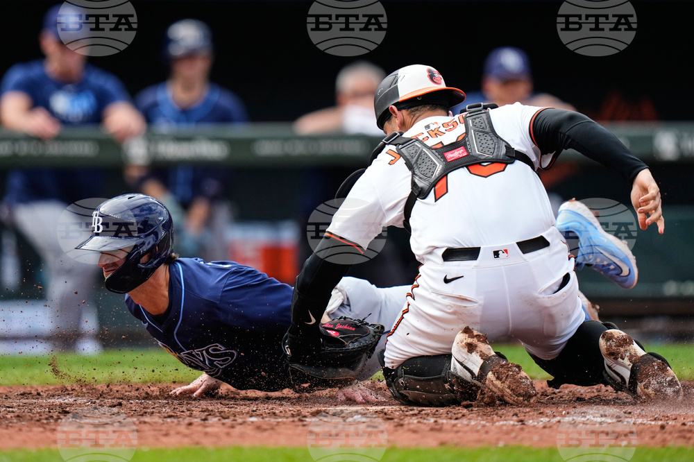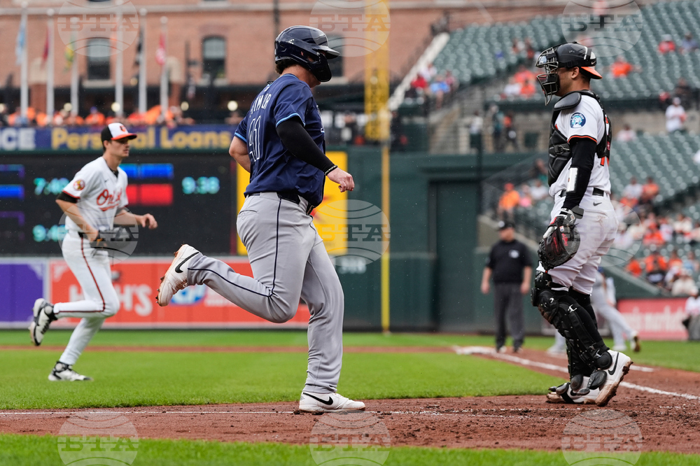Tampa Bay Rays' Bob Seymour, center, scores past Baltimore Orioles catcher Alex Jackson, right, on a two-run double hit by Christopher Morel during the third inning of a baseball game, Thursday, Sept. 25, 2025, in Baltimore. (AP Photo/Stephanie Scarbrough)