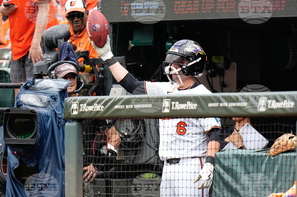 Baltimore Orioles' Ryan Mountcastle (6), wearing a Baltimore Ravens football helmet, holds up a football as he celebrates in the dugout after hitting a home run during the third inning of a baseball game against the Tampa Bay Rays, Thursday, Sept. 25, 2025, in Baltimore. (AP Photo/Stephanie Scarbrough)