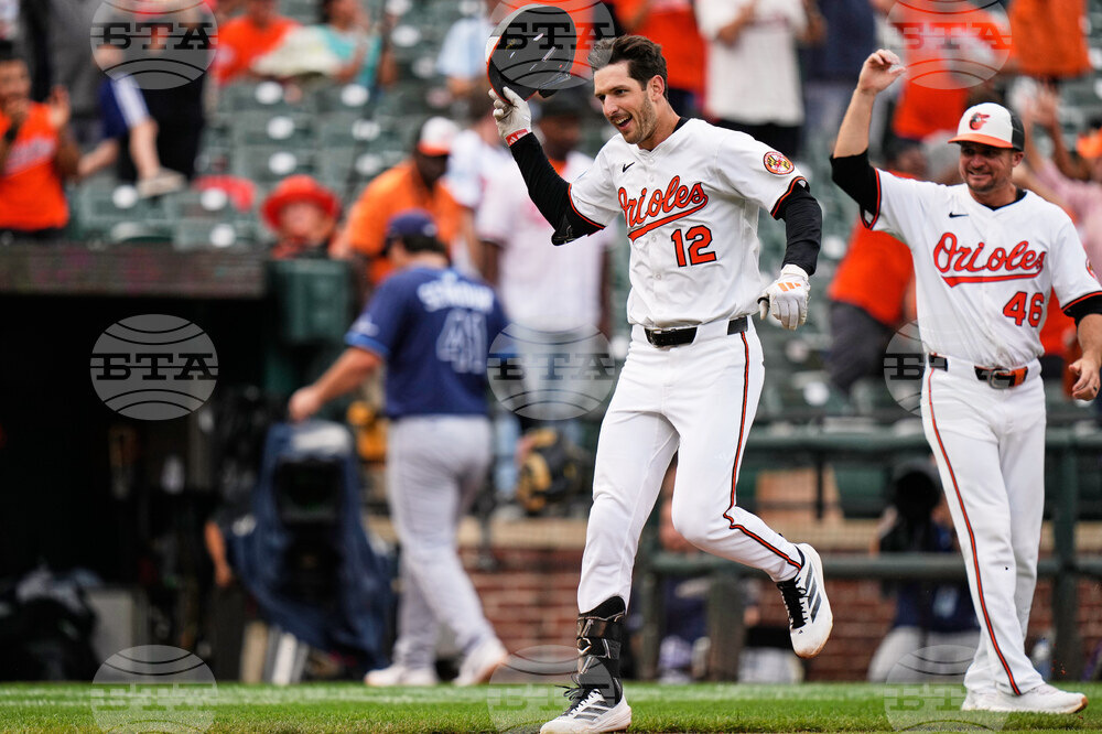 Baltimore Orioles' Dylan Beavers (12) reacts after hitting a walk-off home run in the ninth inning of a baseball game against the Tampa Bay Rays, Thursday, Sept. 25, 2025, in Baltimore. (AP Photo/Stephanie Scarbrough)
