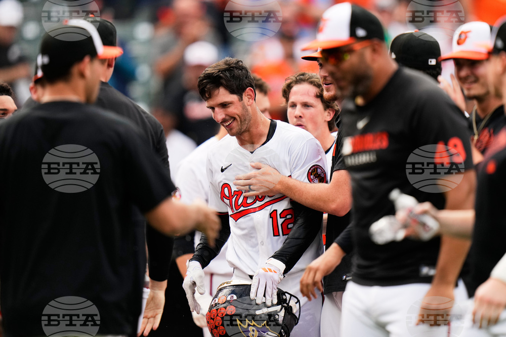 Baltimore Orioles' Dylan Beavers (12) celebrates with teammates after hitting a walk-off home run iin the ninth inning of a baseball game against the Tampa Bay Rays, Thursday, Sept. 25, 2025, in Baltimore. (AP Photo/Stephanie Scarbrough)