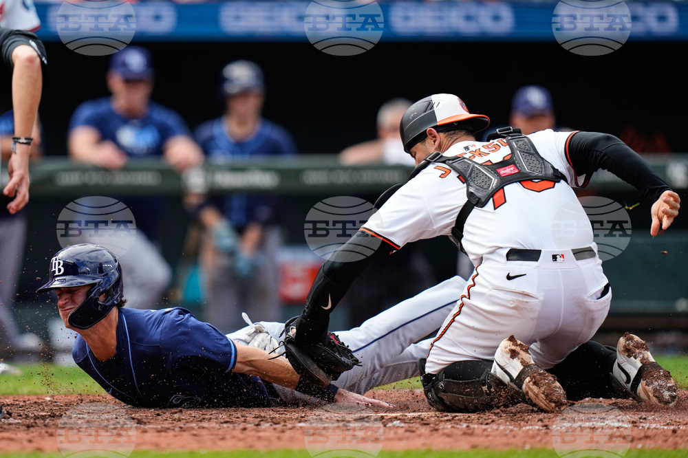 Tampa Bay Rays' Carson Williams, left, is tagged out at home plate by Baltimore Orioles catcher Alex Jackson, left, during the sixth inning of a baseball game, Thursday, Sept. 25, 2025, in Baltimore. (AP Photo/Stephanie Scarbrough)