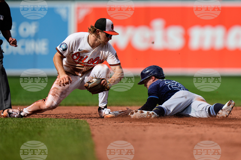 Baltimore Orioles shortstop Gunner Henderson awaits a throw as Tampa Bay Rays Chandler Simpson slides into second base for a double in the seventh inning of a baseball game, Wednesday, Sept. 24, 2025, in Baltimore. (AP Photo/Gail Burton)
