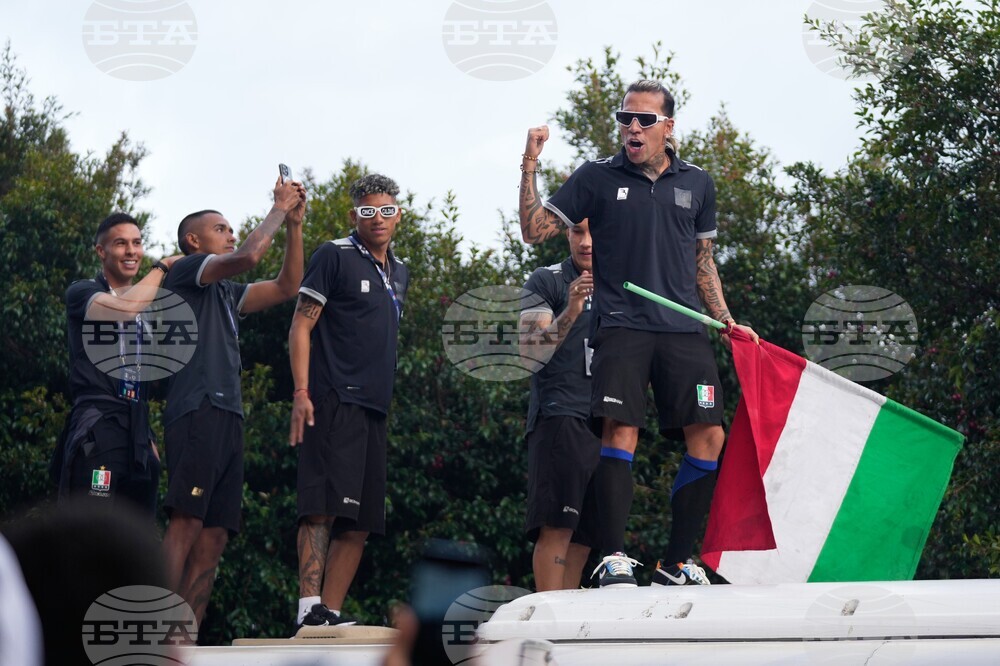 Players of Colombia's Once Caldas, waves fans as they arrive to stadium prior a Copa Sudamericana quarterfinal second leg soccer match against Ecuador's Independiente del Valle in Manizales, Colombia, Wednesday, Sept. 24, 2025. (AP Photo/Fernando Vergara)