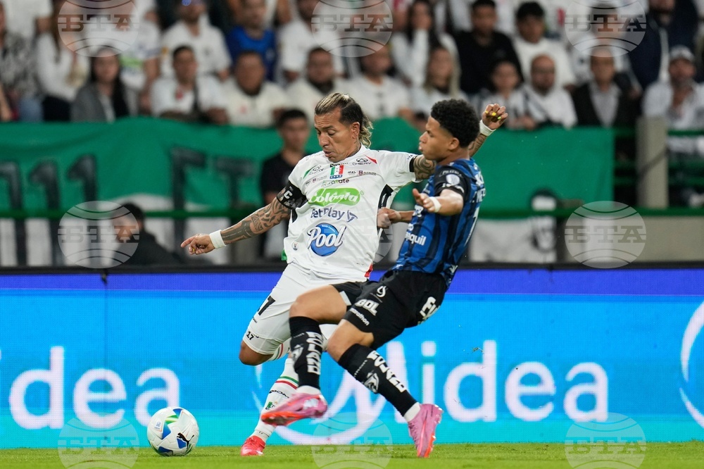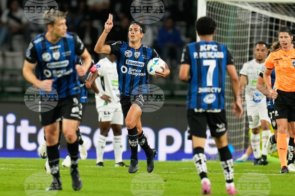 Michael Hoyos of Ecuador's Independiente del Valle celebrates scoring his side's second goal against Colombia's Once Caldas during a Copa Sudamericana quarterfinal second leg soccer match at Palo Grande Stadium in Manizales, Colombia, Wednesday, Sept. 24, 2025.