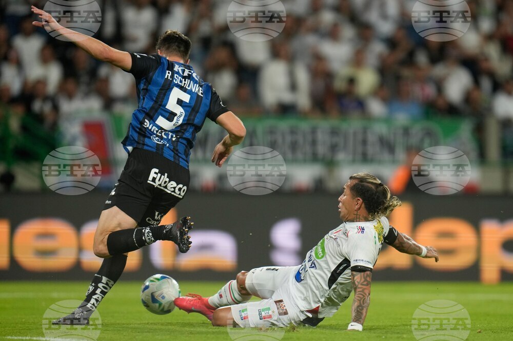 Claudio Spinelli of Ecuador's Independiente del Valle dribbles challenged by Kevin Cuesta of Colombia's Once Caldas fight for the ball during a Copa Sudamericana quarterfinal second leg soccer match at Palo Grande Stadium in Manizales, Colombia, Wednesday, Sept. 24, 2025. (AP Photo/Fernando Vergara)