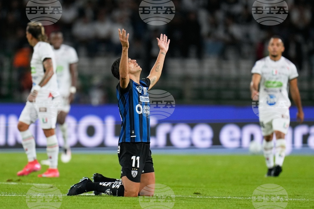 Michael Hoyos of Ecuador's Independiente del Valle celebrates scoring his side's opening goal against Colombia's Once Caldas during a Copa Sudamericana quarterfinal second leg soccer match at Palo Grande Stadium in Manizales, Colombia, Wednesday, Sept. 24, 2025. (AP Photo/Fernando Vergara)