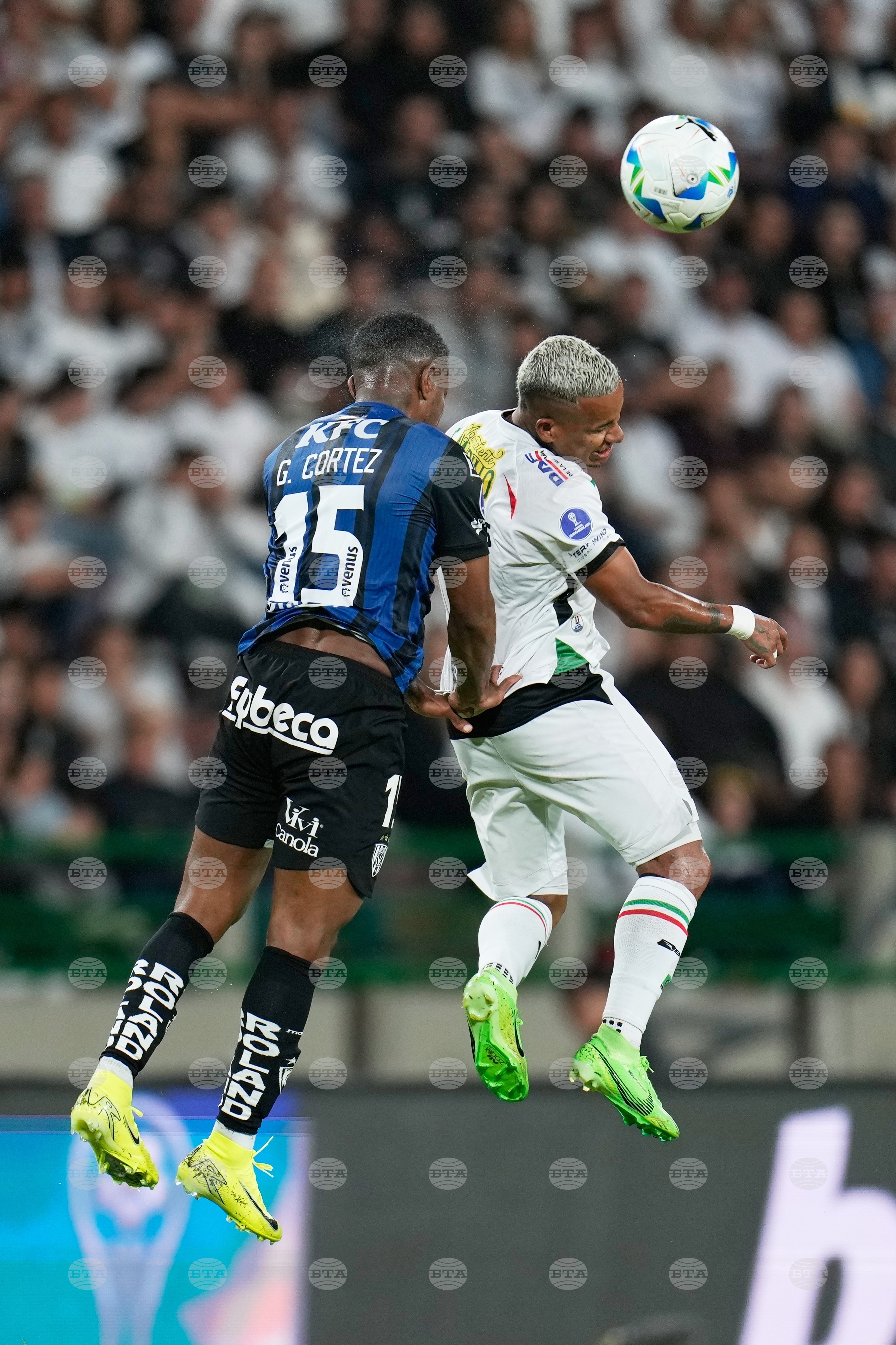 Luis Palacios of Colombia's Once Caldas, left, and Alex Ibarra of Ecuador's Independiente del Valle fight for the ball during a Copa Sudamericana quarterfinal second leg soccer match at Palo Grande Stadium in Manizales, Colombia, Wednesday, Sept. 24, 2025. (AP Photo/Fernando Vergara)