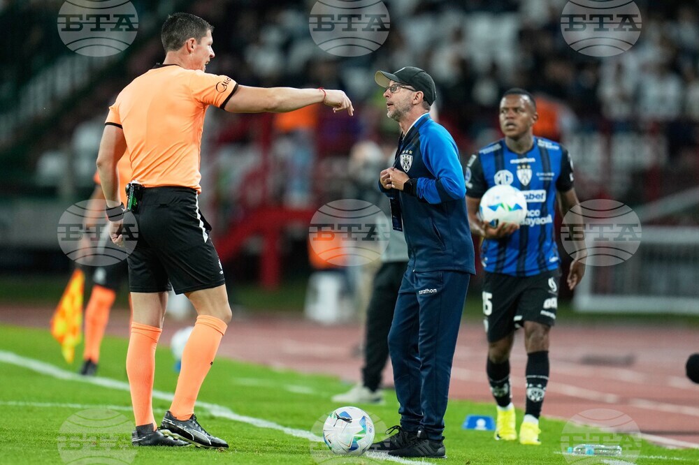 Referee Maximiliano Ramirez, discuss with coach Francisco Rabanal of Ecuador's Independiente del Valle during a Copa Sudamericana quarterfinal second leg soccer match against Colombia's Once Caldas at Palo Grande Stadium in Manizales, Colombia, Wednesday, Sept. 24, 2025. (AP Photo/Fernando Vergara)