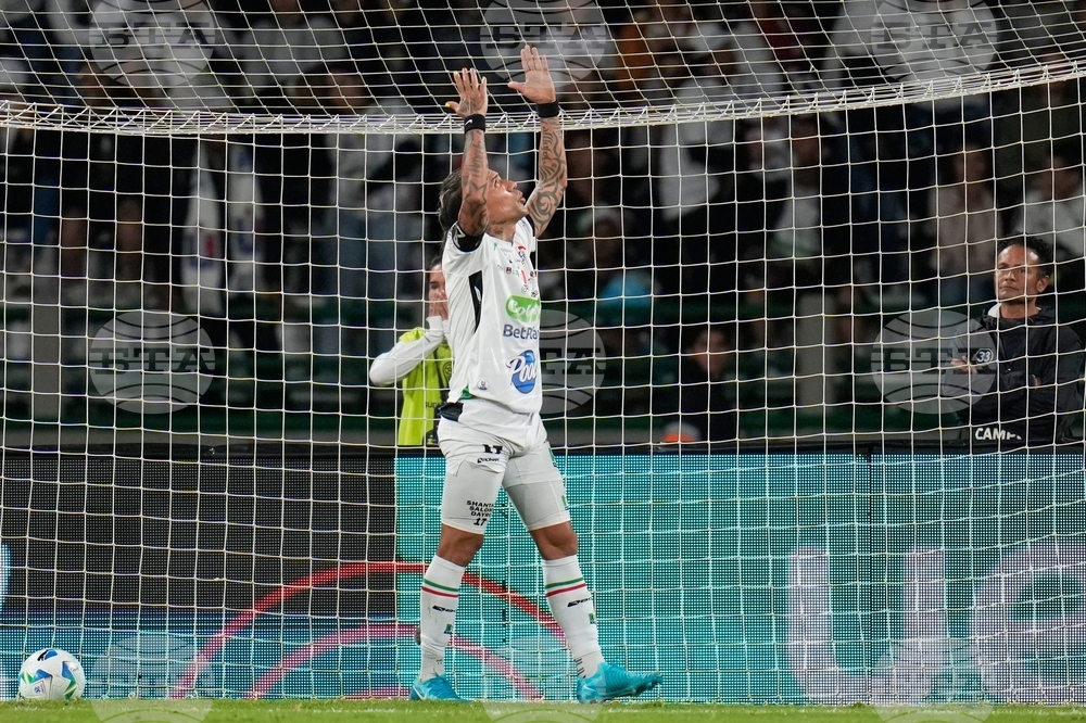 Dayro Moreno of Colombia's Once Caldas, reacts after fails an opportunity to scores during a Copa Sudamericana quarterfinal second leg soccer match against Ecuador's Independiente del Valle at Palo Grande Stadium in Manizales, Colombia, Wednesday, Sept. 24, 2025. (AP Photo/Fernando Vergara)