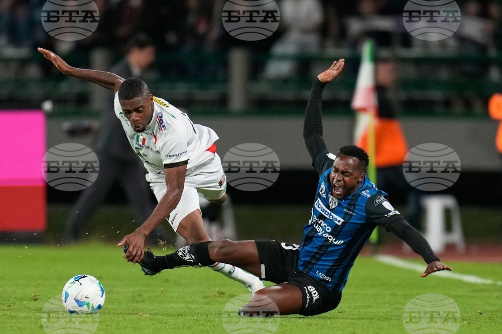 Mateo Zuleta of Colombia's Once Caldas, top, and Andy Velasco of Ecuador's Independiente del Valle fight for the ball during a Copa Sudamericana quarterfinal second leg soccer match at Palo Grande stadium in Manizales, Colombia, Wednesday, Sept. 24, 2025. (AP Photo/Fernando Vergara)
