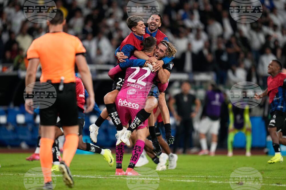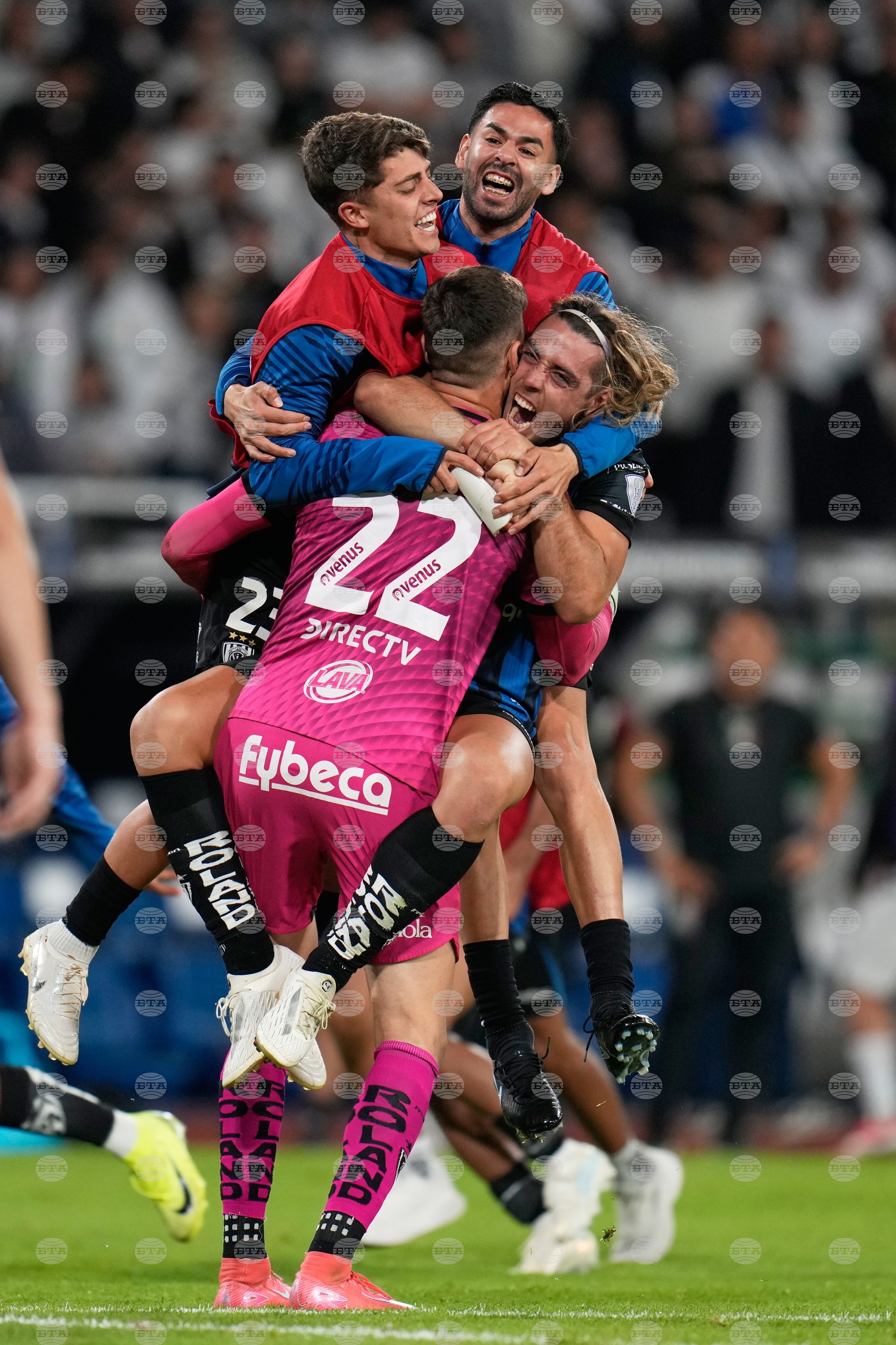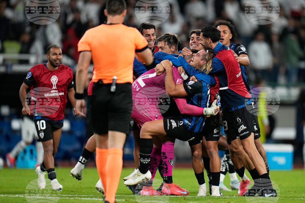 Players of Ecuador's Independiente del Valle celebrate after winning a penalty shootout against Colombia's Once Caldas in a Copa Libertadores quarterfinal second leg soccer match in Manizales, Colombia, Wednesday, Sept. 24, 2025. (AP Photo/Fernando Vergara)