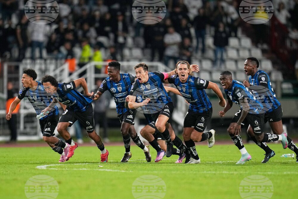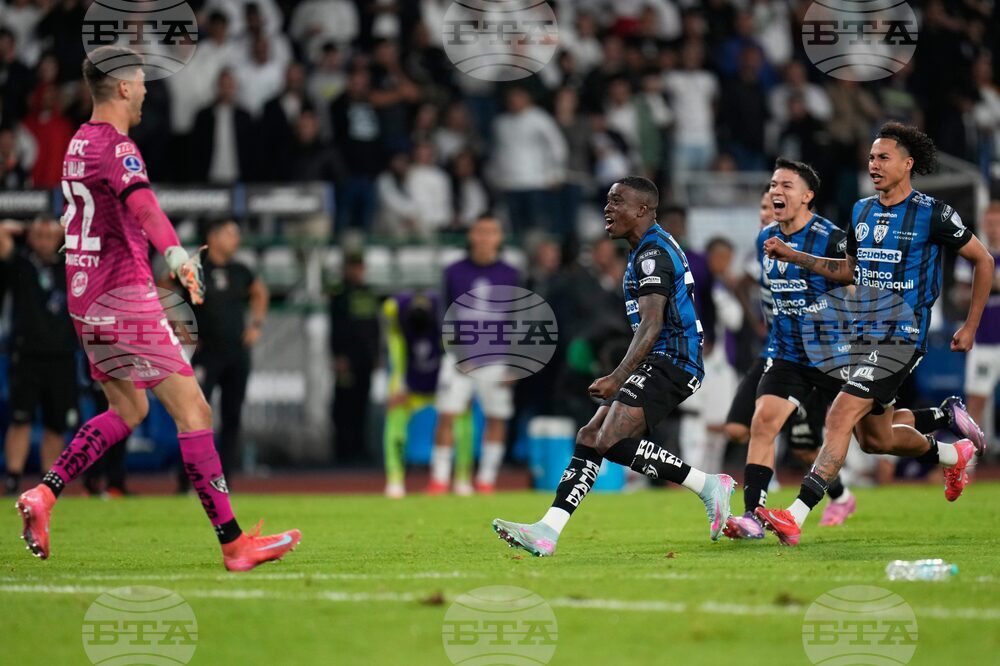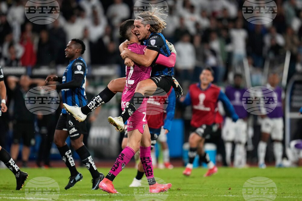 Ecuador's Independiente del Valle players celebrate after winning a penalty shootout against Colombia's Once Caldas in a Copa Libertadores quarterfinal second leg soccer match in Manizales, Colombia, Wednesday, Sept. 24, 2025. (AP Photo/Fernando Vergara)