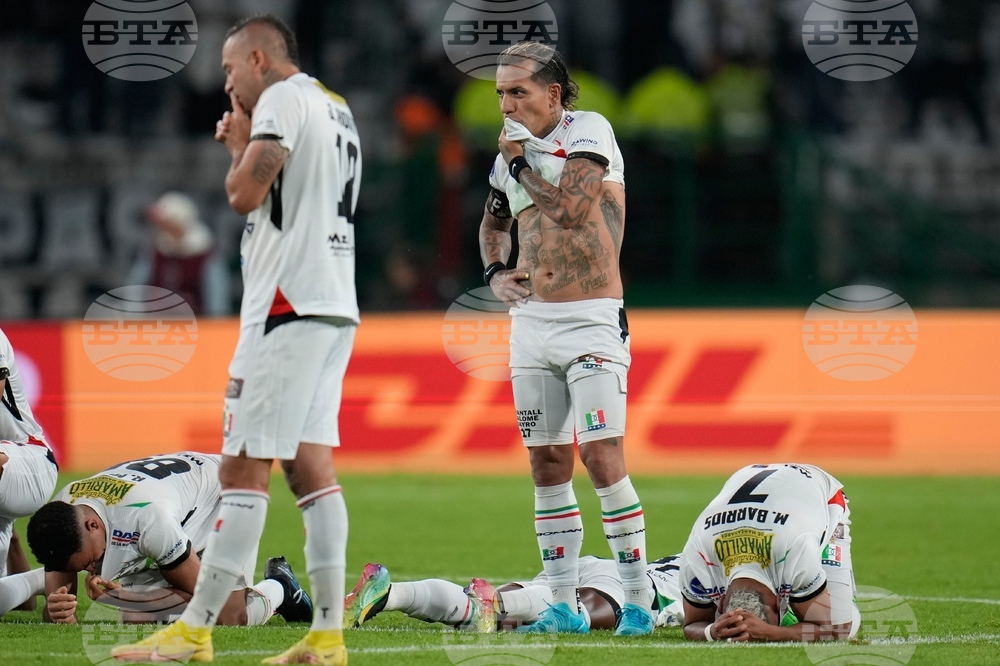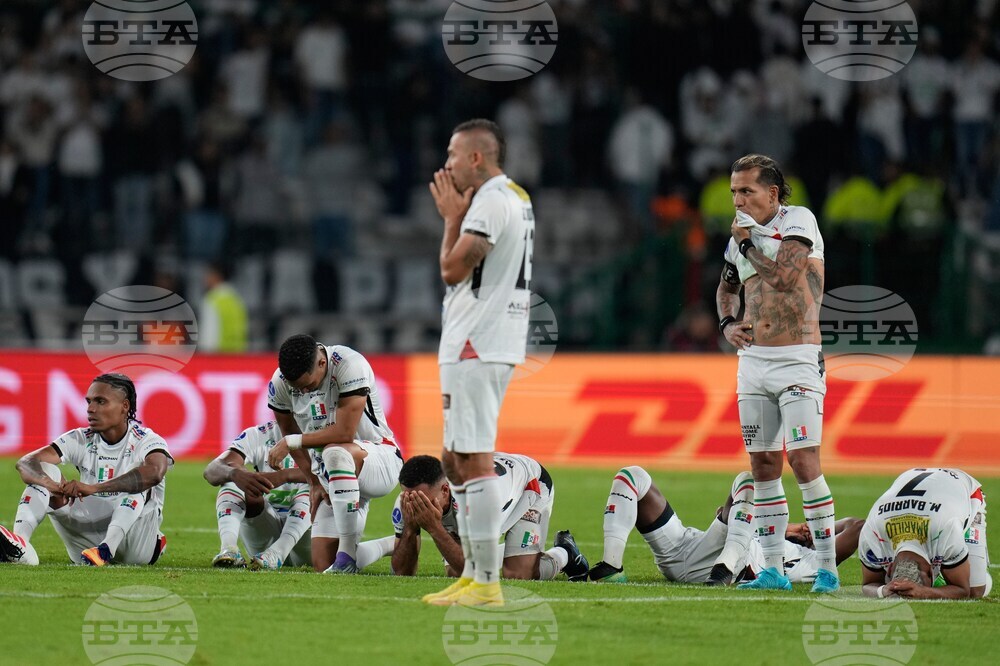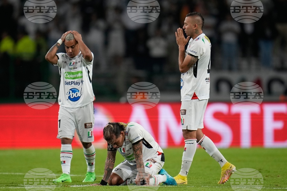 Colombia's Once Caldas players react after their loss a penalty shootout against Ecuador's Independiente del Valle in a Copa Libertadores quarterfinal second leg soccer match in Manizales, Colombia, Wednesday, Sept. 24, 2025. (AP Photo/Fernando Vergara)