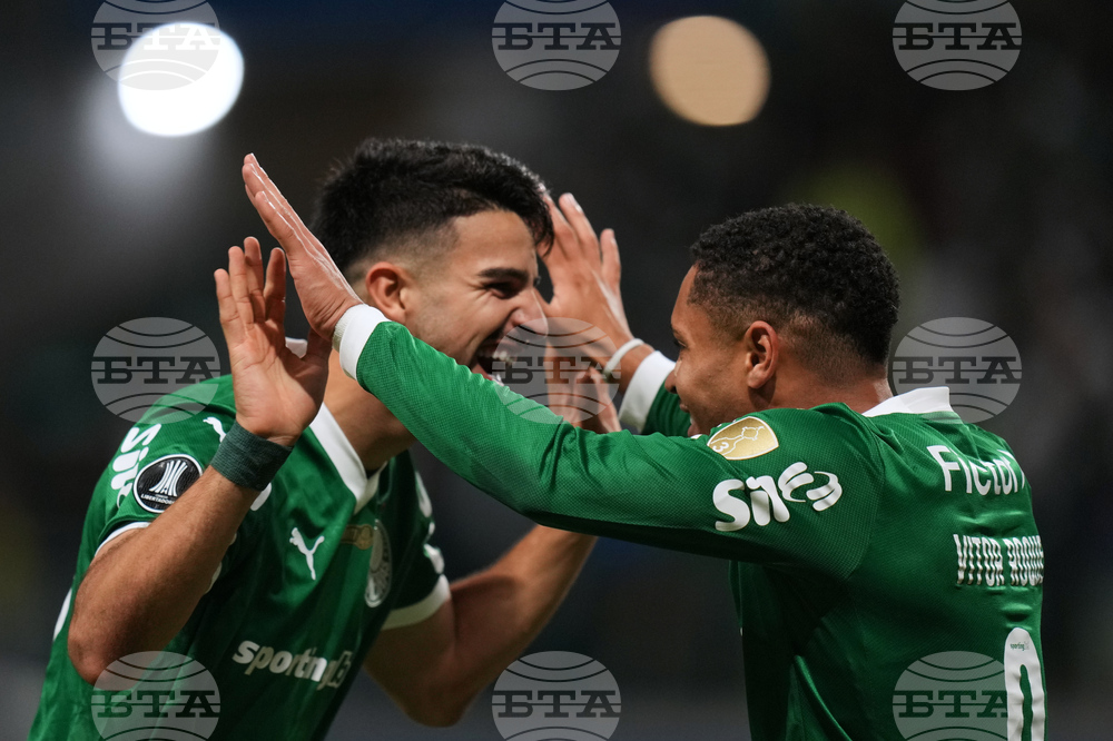 Vitor Roque of Brazil's Palmeiras, right, celebrates with Jose Manuel Lopez of Brazil's Palmeiras after scoring his side's opening goal against Argentina's River Plate during a World Cup 2026 qualifying soccer match at Neo Quimica Arena in Sao Paulo, Tuesday, June 10, 2025. (AP Photo/Andre Penner)