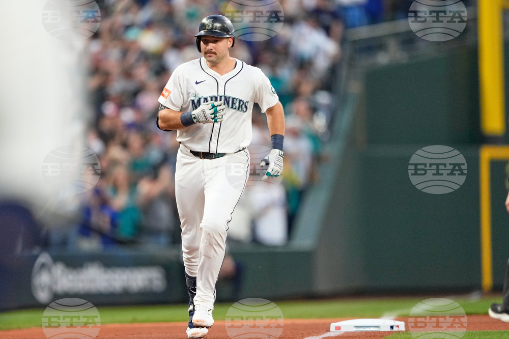 Seattle Mariners' Cal Raleigh runs the bases after hitting a solo home run during the first inning of a baseball game against the Colorado Rockies, Wednesday, Sept. 24, 2025, in Seattle. (AP Photo/Ryan Sun)