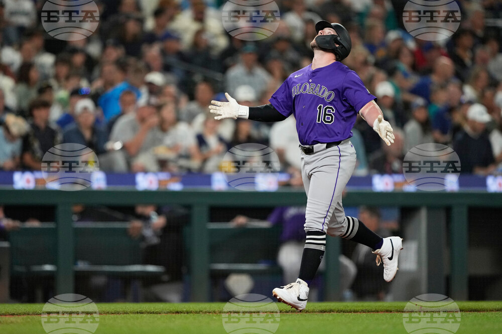 Colorado Rockies designated hitter Blaine Crim gestures after hitting a solo home run during the fourth inning of a baseball game against the Seattle Mariners, Wednesday, Sept. 24, 2025, in Seattle. (AP Photo/Ryan Sun)