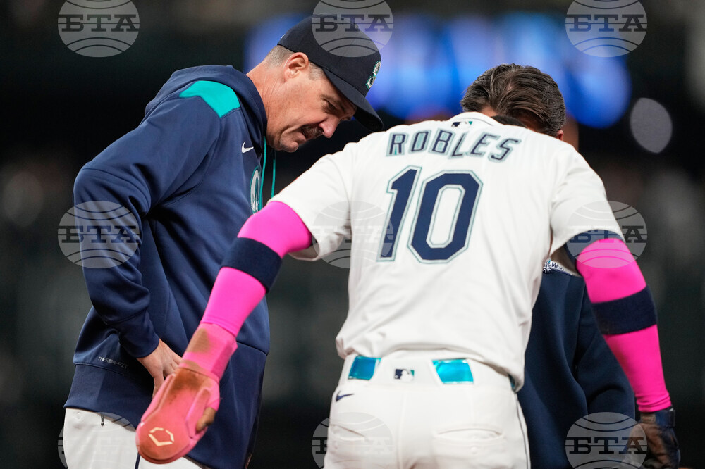Seattle Mariners manager Dan Wilson, left, checks on Victor Robles after a pick off attempt by Colorado Rockies starting pitcher Tanner Gordon during the fourth inning of a baseball game, Wednesday, Sept. 24, 2025, in Seattle. (AP Photo/Ryan Sun)