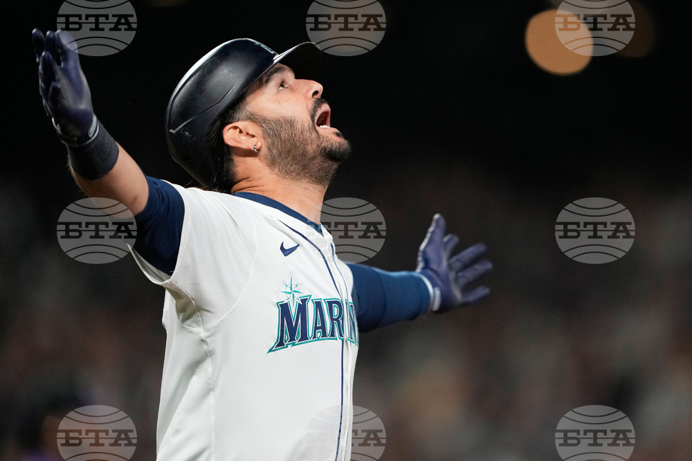 Seattle Mariners' Eugenio Suarez reacts after hitting a solo home run during the seventh inning of a baseball game against the Colorado Rockies, Wednesday, Sept. 24, 2025, in Seattle. (AP Photo/Ryan Sun)