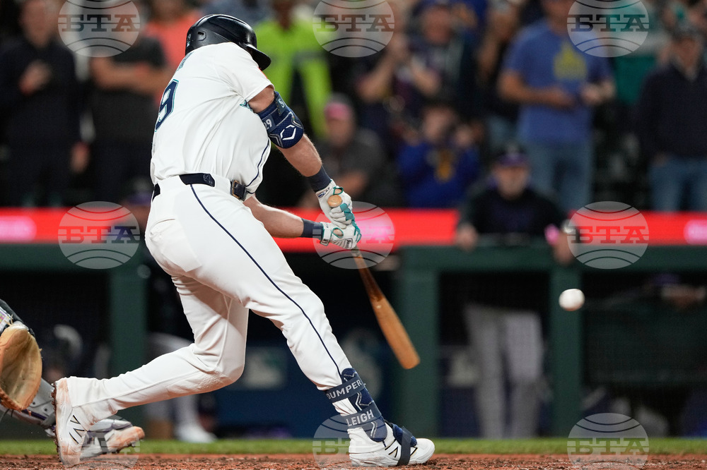 Seattle Mariners center fielder Julio Rodriguez watches a solo home run hit by Colorado Rockies designated hitter Blaine Crim during the fourth inning of a baseball game, Wednesday, Sept. 24, 2025, in Seattle. (AP Photo/Ryan Sun)