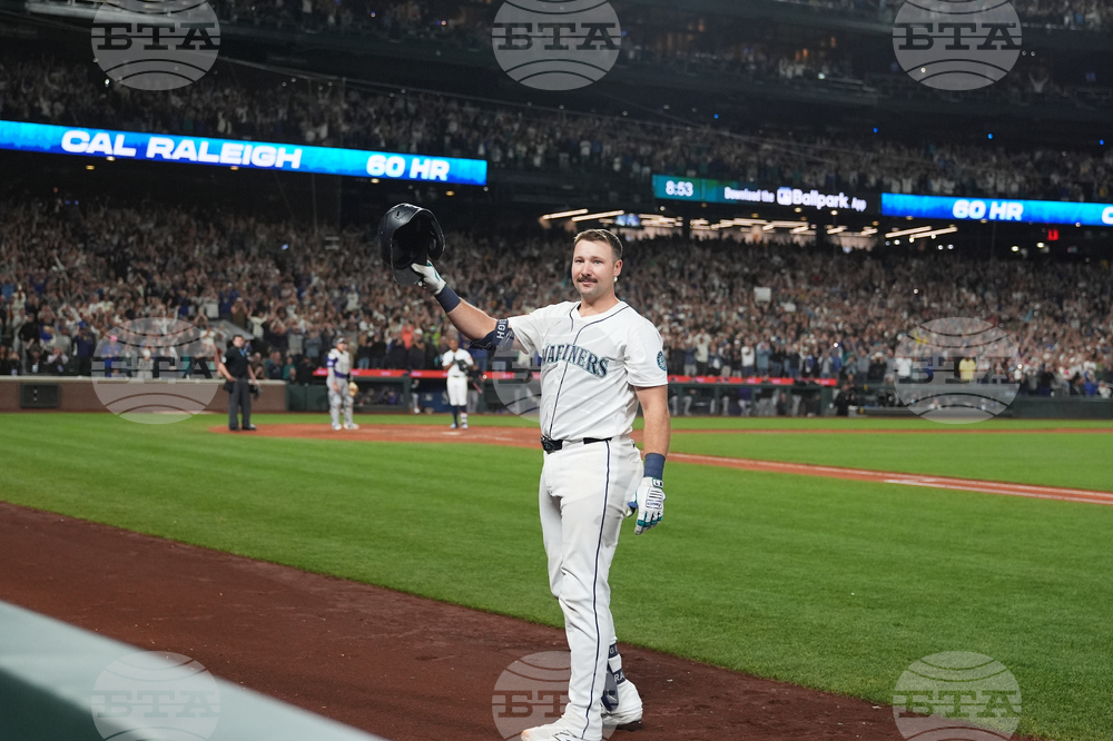 Seattle Mariners' Cal Raleigh hits his 60th home run during the eighth inning of a baseball game against the Colorado Rockies, Wednesday, Sept. 24, 2025, in Seattle. (AP Photo/Ryan Sun)