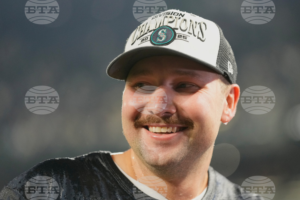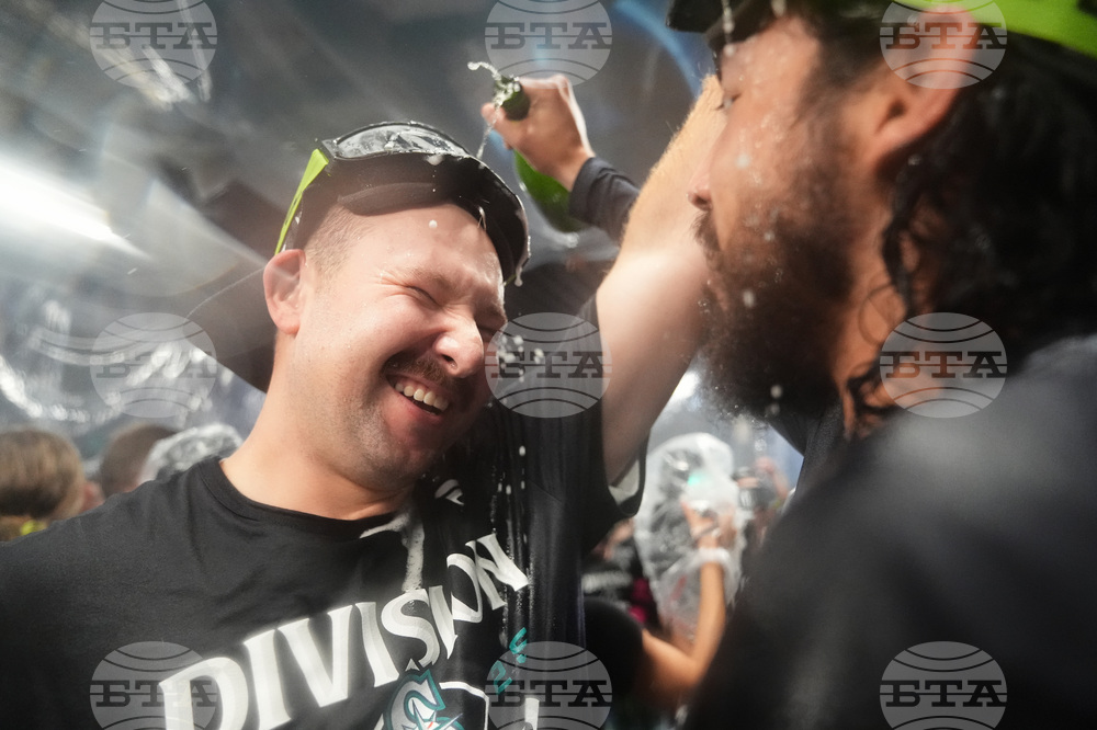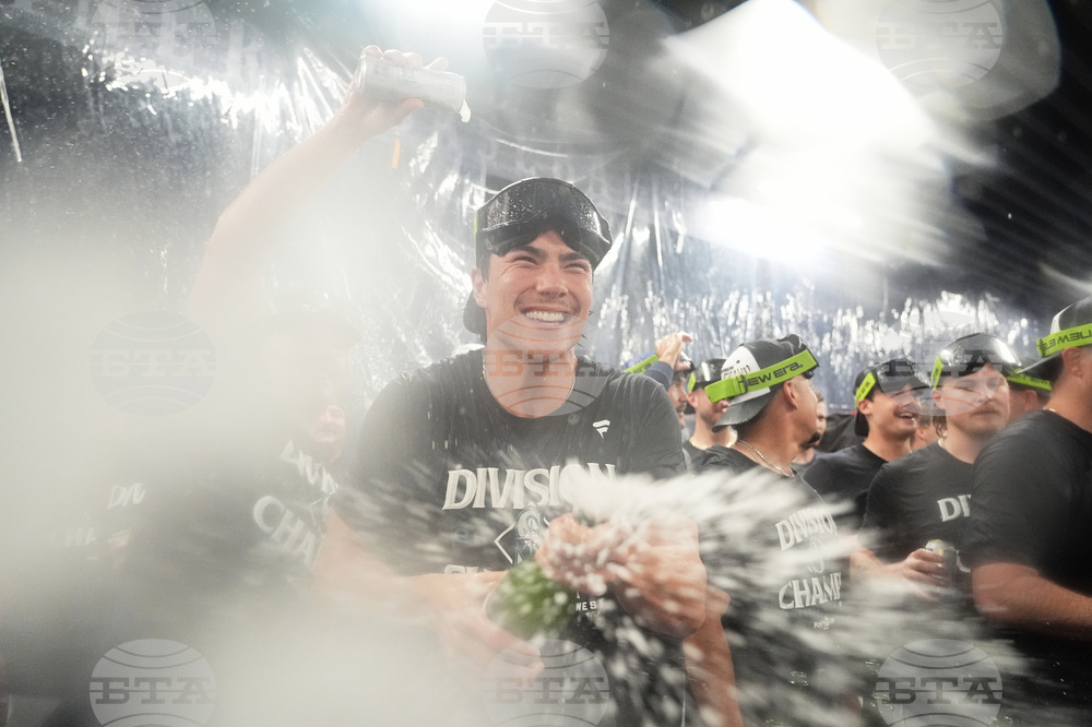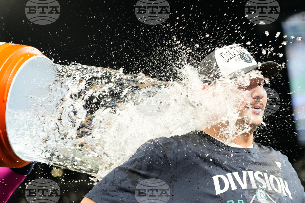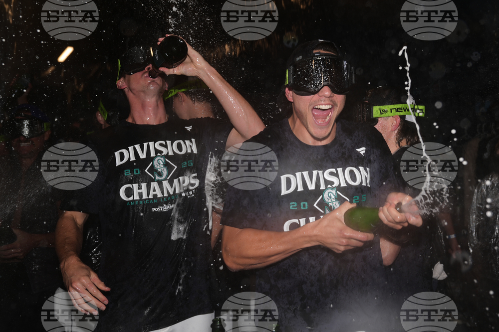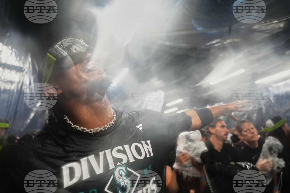 The Seattle Mariners celebrate after the team's win against the Colorado Rockies to clinch the American League West Division, Wednesday, Sept. 24, 2025, in Seattle. (AP Photo/Ryan Sun)