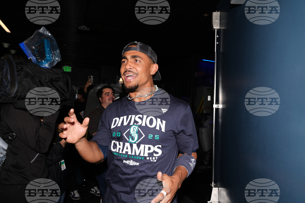 Seattle Mariners center fielder Julio Rodriguez celebrates after the team's win against the Colorado Rockies to clinch the American League West Division, Wednesday, Sept. 24, 2025, in Seattle. (AP Photo/Ryan Sun)