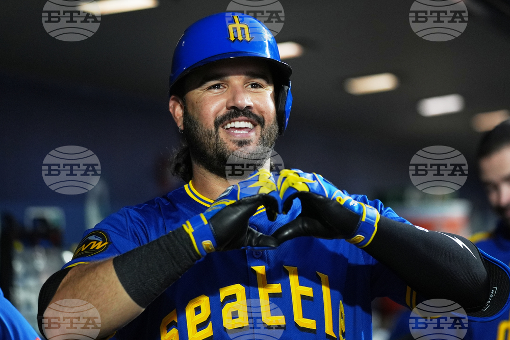 Seattle Mariners' Victor Robles celebrates in the dugout after scoring off a double hit by Cal Raleigh during the second inning of a baseball game against the Colorado Rockies, Wednesday, Sept. 24, 2025, in Seattle. (AP Photo/Ryan Sun)