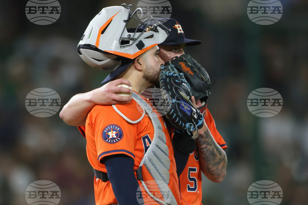 Houston Astros catcher Yainer Diaz, front, and starting pitcher Hunter Brown, behind, talk during a mound visit during the third inning of a baseball game against the Athletics, Wednesday, Sept. 24, 2025, in West Sacramento, Calif. (AP Photo/Scott Marshall)