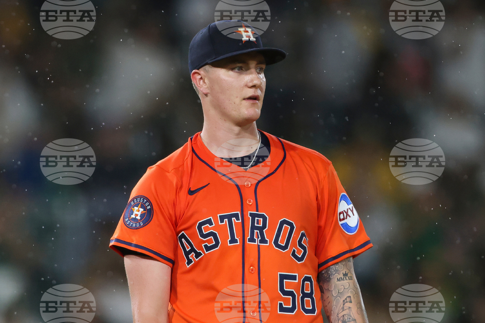 Houston Astros starting pitcher Hunter Brown reacts after giving up an RBI double to Athletics' Shea Langeliers (not shown) during the fifth inning of a baseball game Wednesday, Sept. 24, 2025, in West Sacramento, Calif. (AP Photo/Scott Marshall)