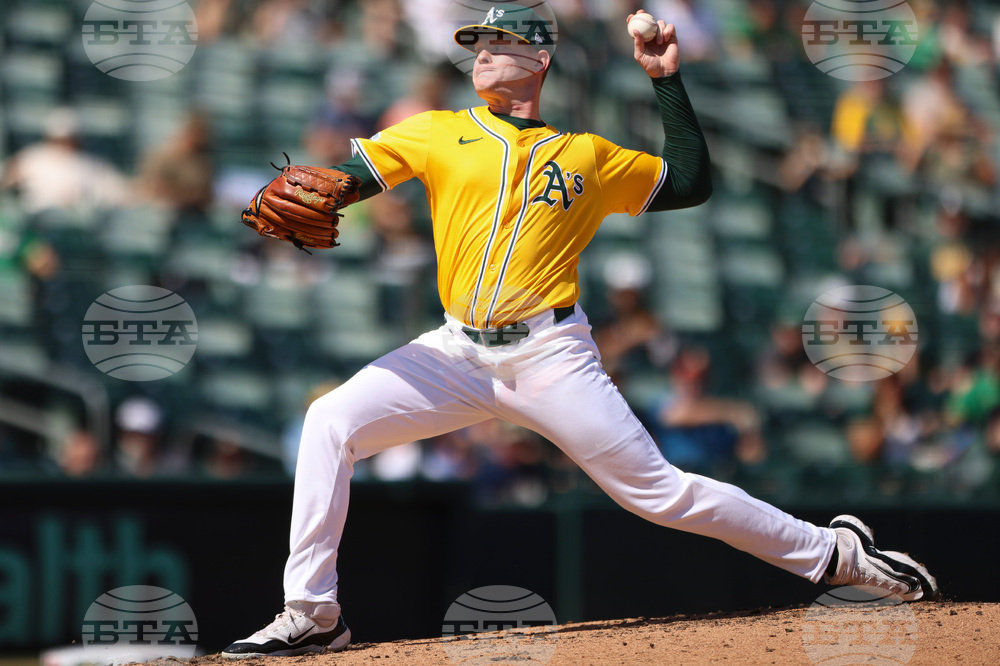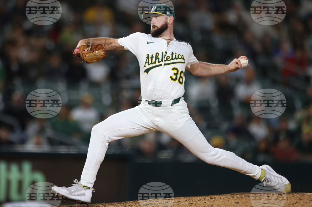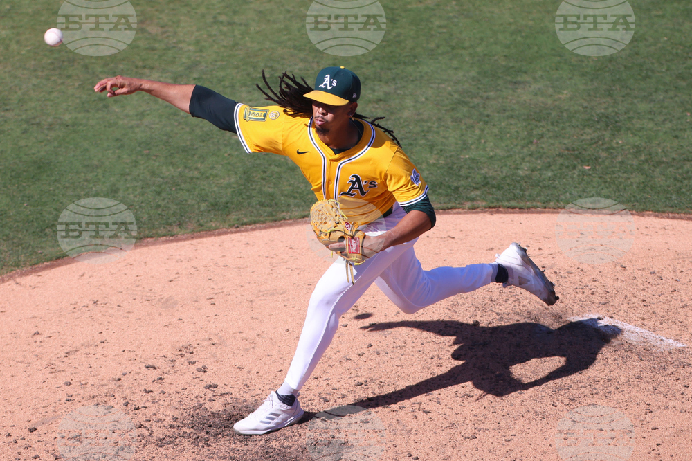 Athletics pitcher Brady Basso throws to an Houston Astros batter during the fourth inning of a baseball game Thursday, Sept. 25, 2025, in West Sacramento, Calif. (AP Photo/Scott Marshall)