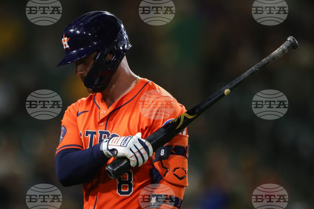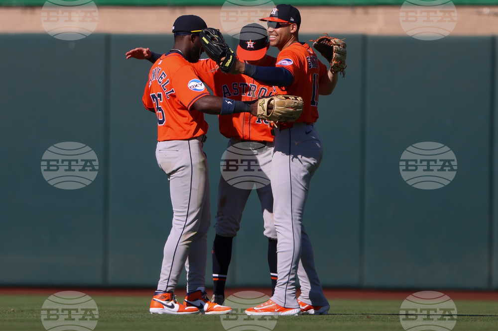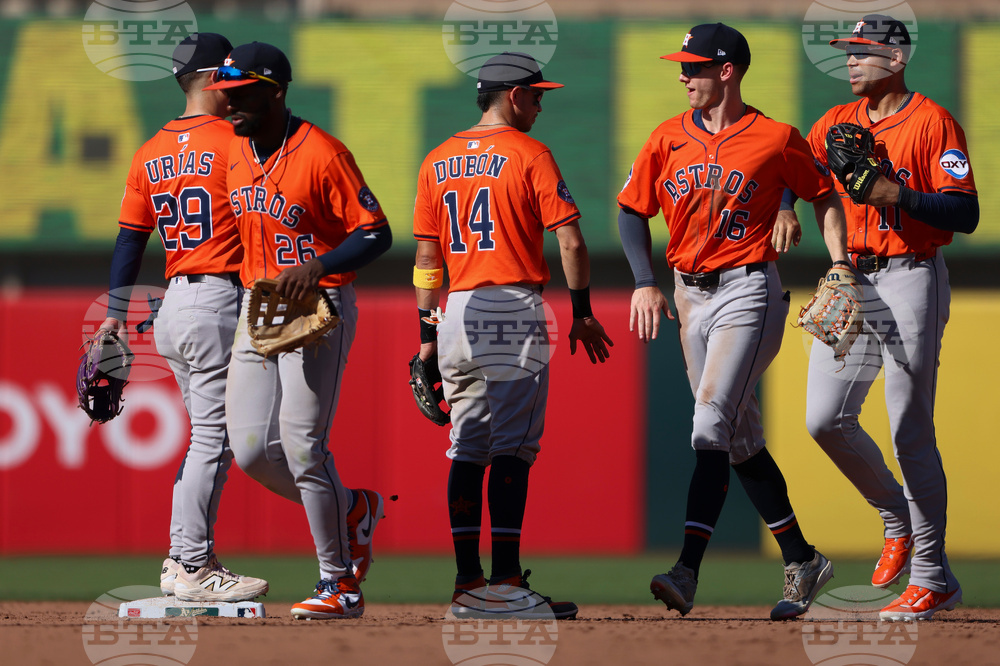 The Houston Astros celebrate their win over the Athletics in a baseball game Thursday, Sept. 25, 2025, in West Sacramento, Calif. (AP Photo/Scott Marshall)
